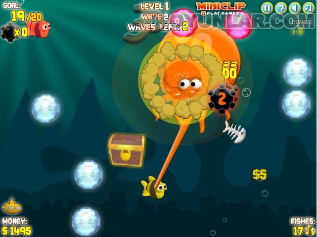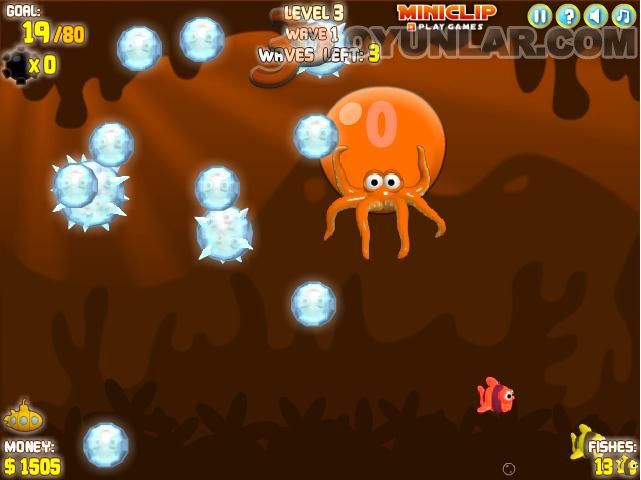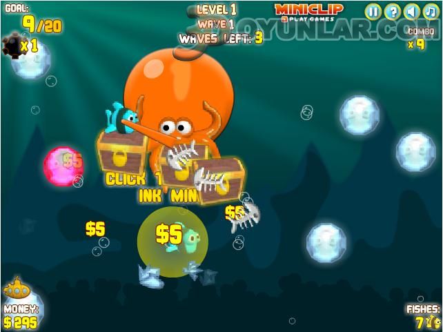 Acıkmış olan ahtapotun karşısına balıkların yanı sıra hazineler de gelmekte. Karnını doyurmakla görevlisin, içi altınlarla ve mücevherlerle dolu olan sandıkları kaçırmazsan görevleri çabucak yerine getirmiş olursun. Bölümlerdeki avantajları kaçırmamak adına hızlı ol ve gözün hep hazinelerde olsun! Patlatacağın bombalar ile ek avantajlar kazanabilirsin. Bombayı patlatacağın yerleri iyi seç ki daha çok balon patlasın ve şansın daha fazla olsun.