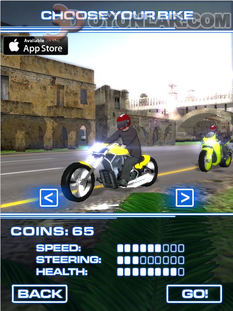 İlk olarak basit motor ile sürüşe GO! butonu ile başlamalısınız. Sonrasında oyun içindeki görevleri tamamladıkça ve para topladıkça yeni motorları alabilirsiniz.