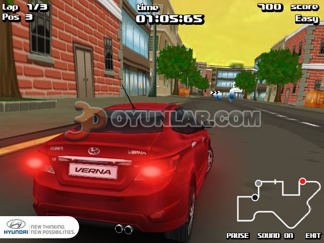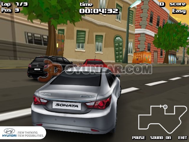 3D Hyundai yarışı oyununda, Verna, Sonata ve Santafe modellerinden birini seçin ve yarışa başlayın.