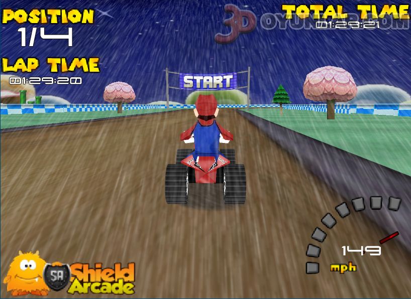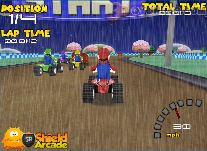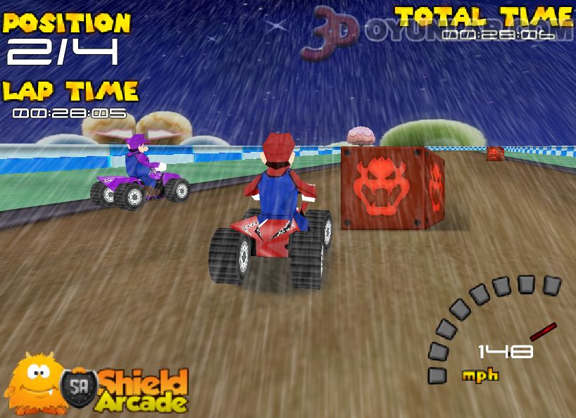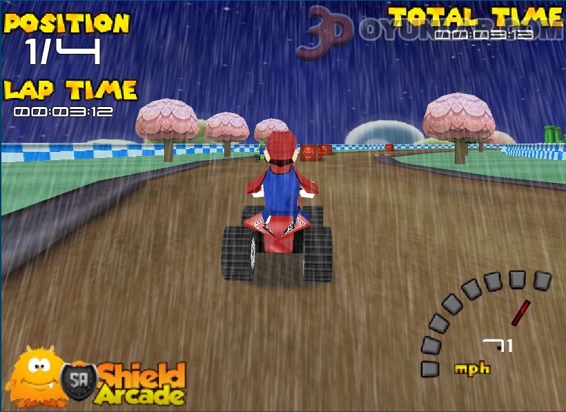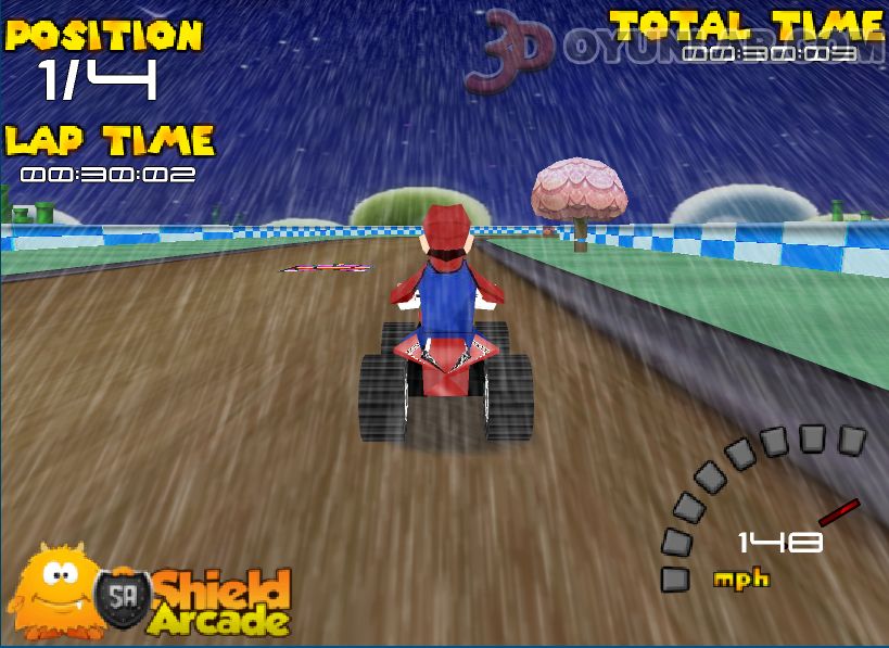 3D mario motor yarışı oyunu ile sevdiğiniz oyun karakteri mario yağmurlu bir havada motor yarışına katılıyor.