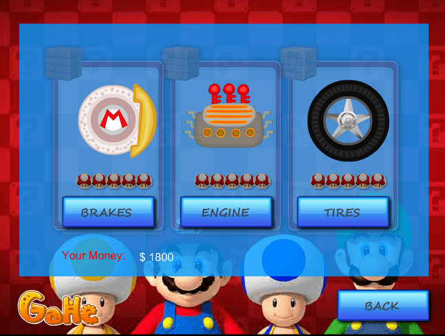 Ana menüde GARAGE butonuna bastığınızda karşınıza arabanızın BRAKES, ENGINE ,TIRES özelliklerini güçlendirebilirsiniz
