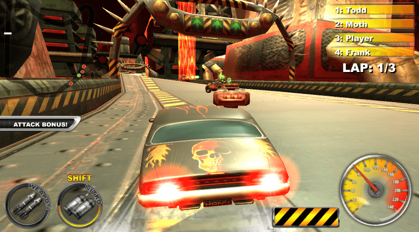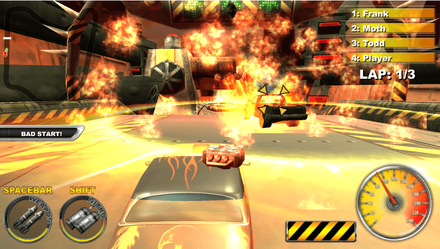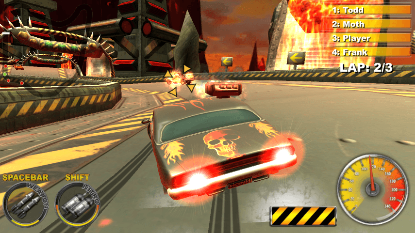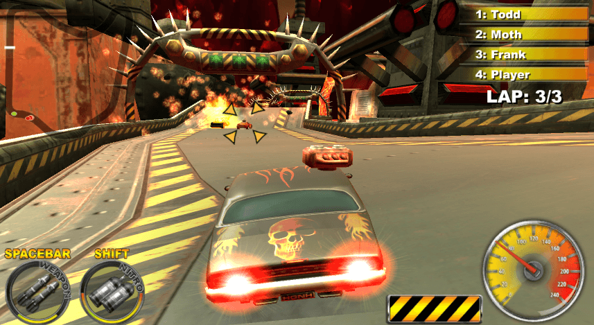 3D Ölümcül Yarış oyununda rakiplerinizle beraber tehlikeli engellerle dolu yolda ilerlerken silahınızı kullanmalı ve birinci olmak için elinizden geleni yapmalısınız.
