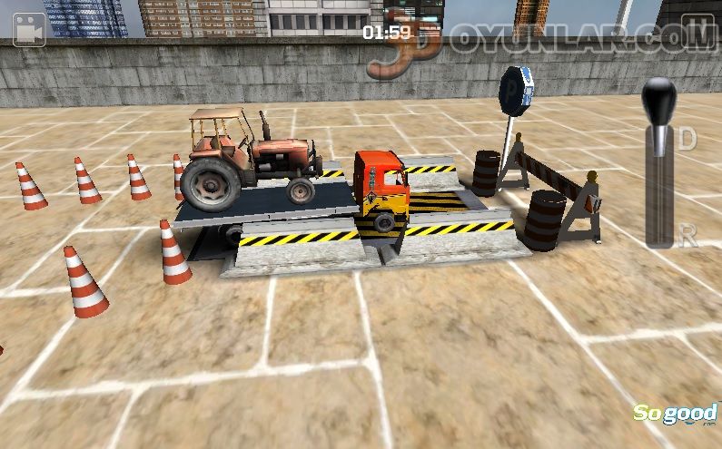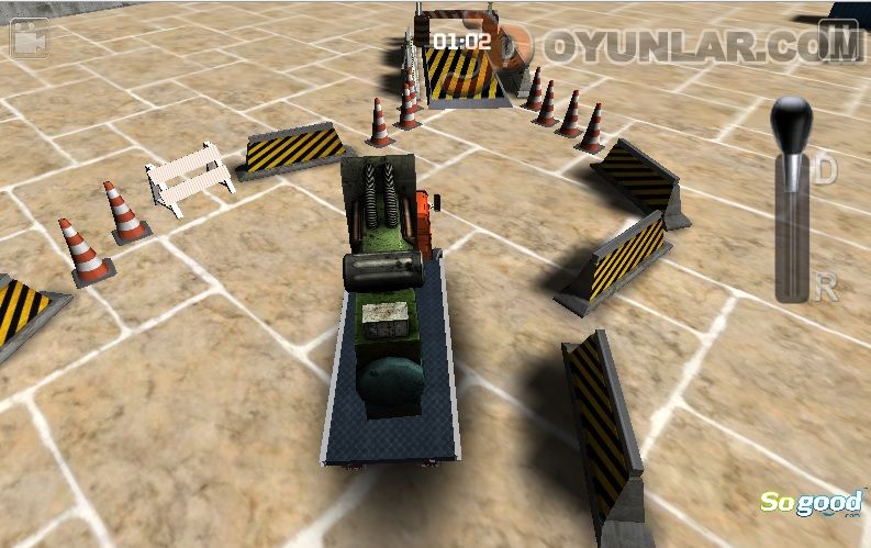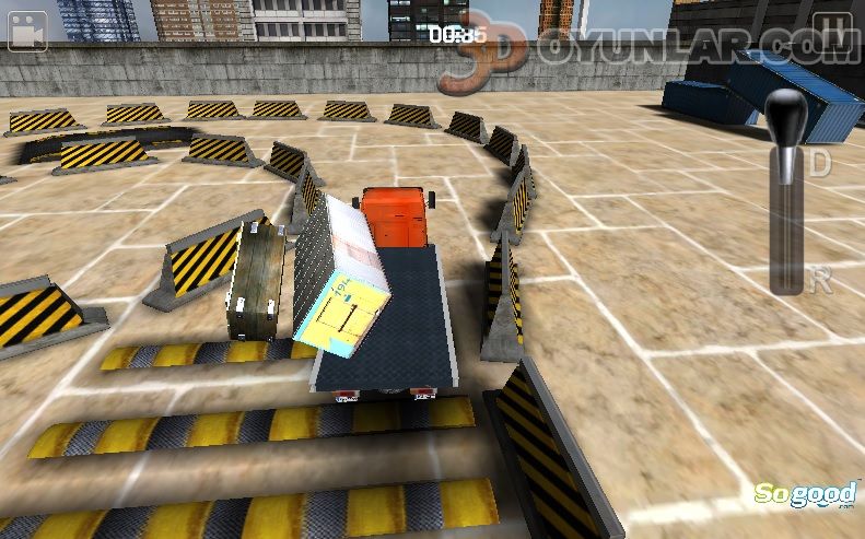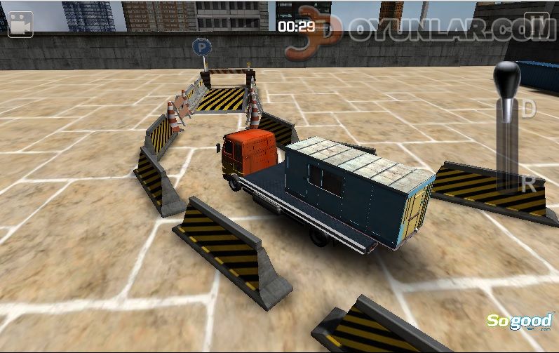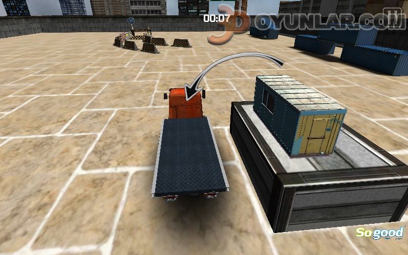 3D Ağır Yük Kamyonu ile kamyonumuz gösterilen noktaya hiçbir yere çarpmadan ve üstünde ki ağır yükleri düşürmeden park etmeye çalışın.