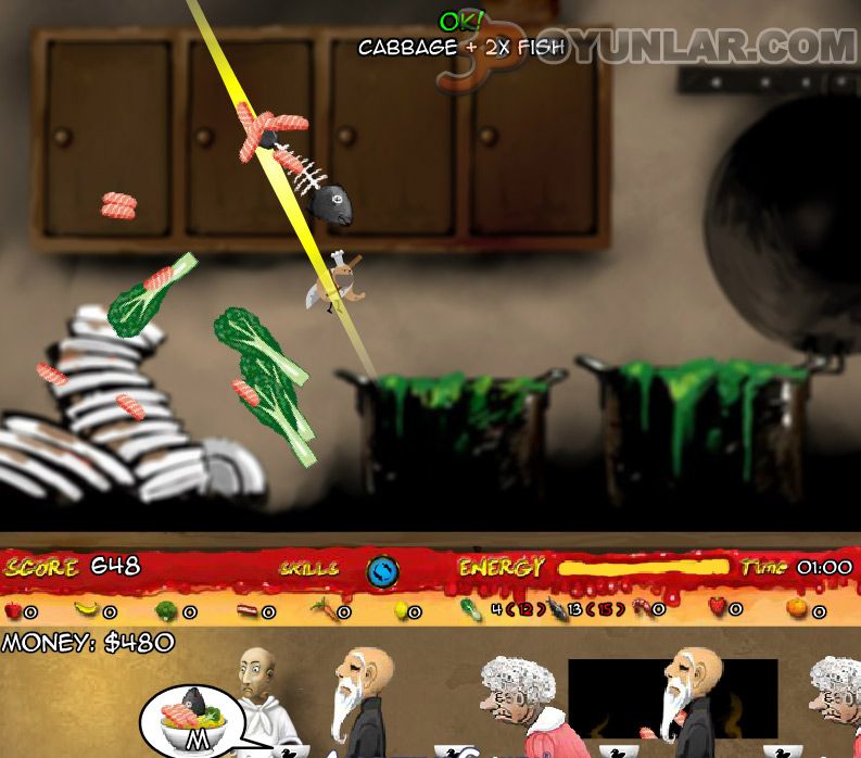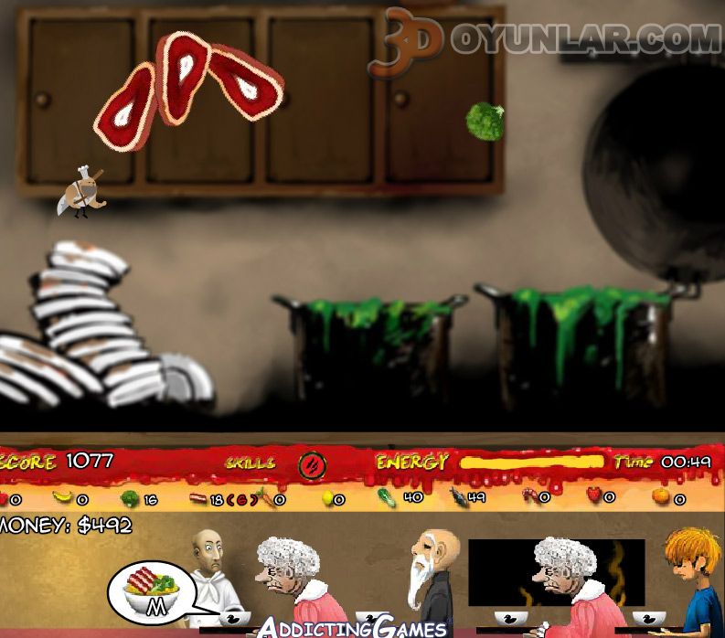 Kung fu şef oyunu,  müşteriler yemek sırasındalar ve sizden kesmenizi istenen ürün ve sayısı alt bölümde kırmızı olarak gösteriliyor.