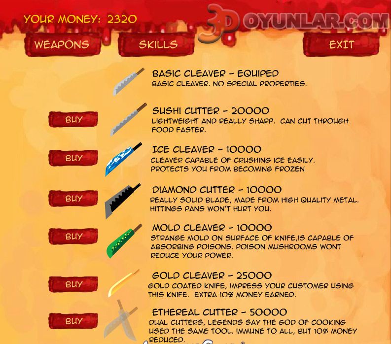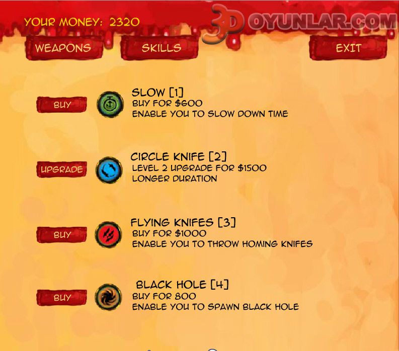 Kazandığınız paralar ile daha keskin ve büyük bıçak  yada yardımcı özellikler satın alabilirsiniz.
