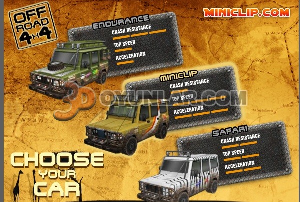 PLAY butonunu tıkladığımızda karşımıza ENDURANCE ( dayanıklılık ) ,MINICLIP ve SAFARİ olarak adlandrılan 3 ayrı arazi aracı çıkacak.