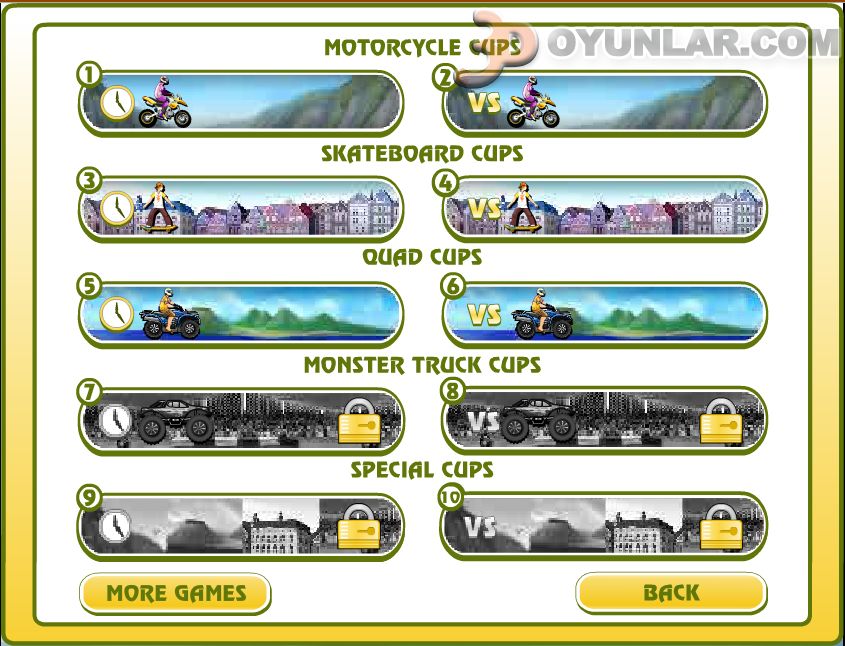 PLAY GAME butonu ile oyuna başlayabilirsiniz. Motor, kaykay, atv, kamyon ve benzeri araçları sürme şansınızın olduğu bu oyunda havadayken hareket yapmanız puan kazanmanızı sağlayacak temel kuraldır.