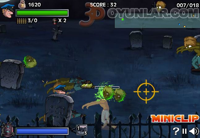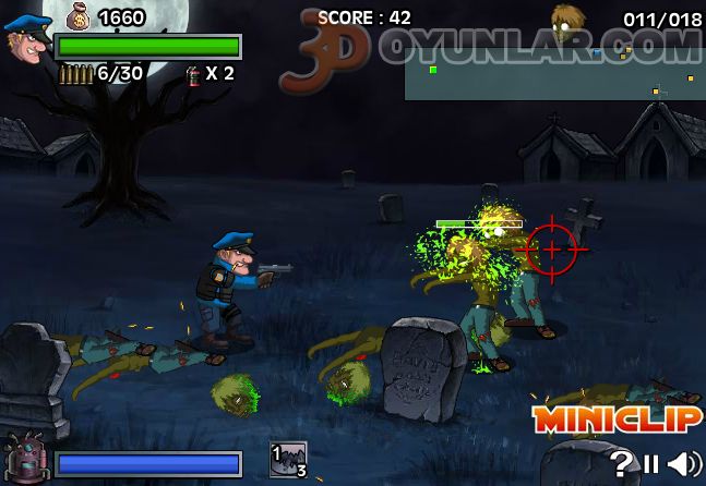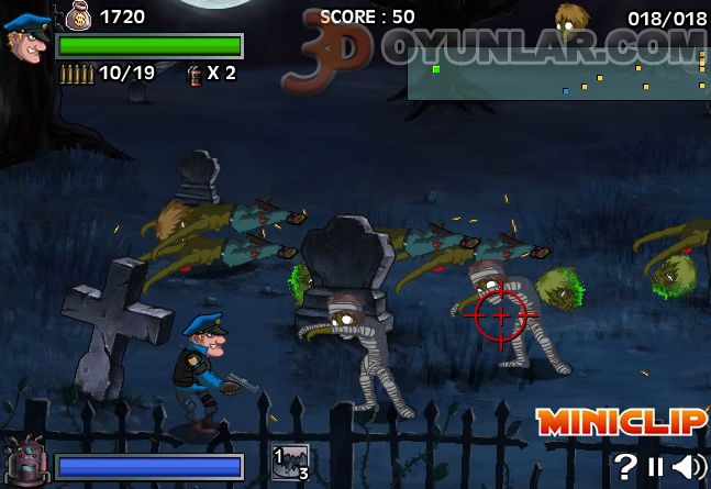 Oyunda polis karakteriniz ile saldırı düzenleyen düşman zombileri yok etmelisiniz.